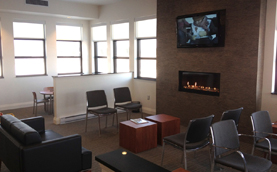 • The reception area has a generous play area for children, a television, fireplace, and plenty of comfortable seating.
